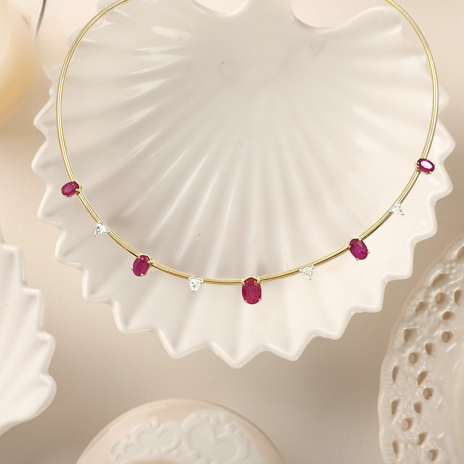 The Petal Collar Neckband from the Bloom Collection features rubies and diamonds, symbolising vitality, resilience, and the beauty of blooming through change.