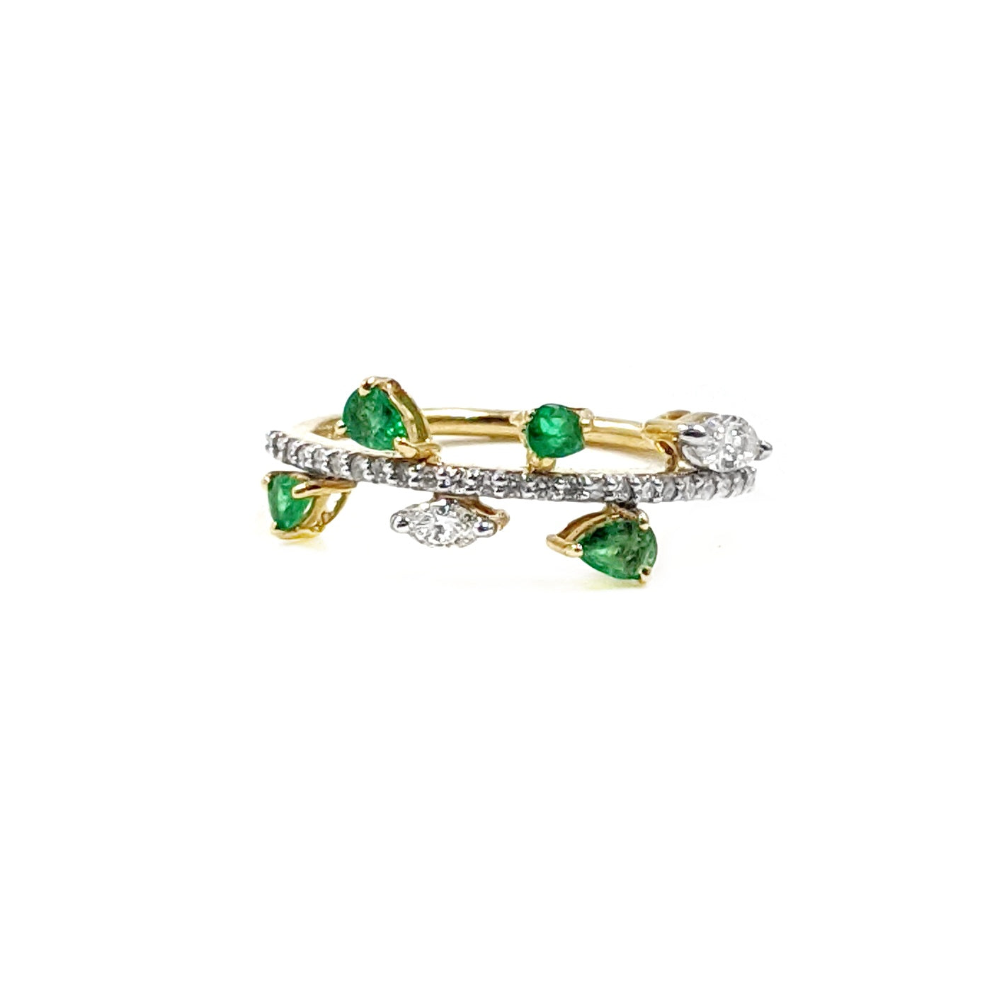 Rise mix shape emerald round diamond ring in 18 carat in yellow gold.